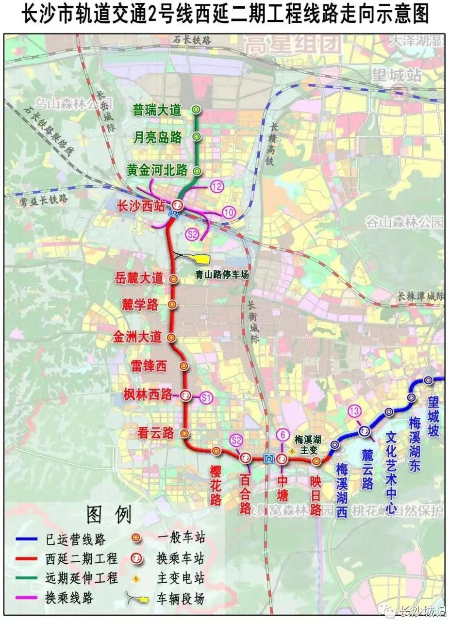 2号线西延二期工程起于长沙西站,沿汇智路往南引入梅溪湖核心片区,再沿梅溪湖中轴线往东,止于梅溪湖西站(不含)。