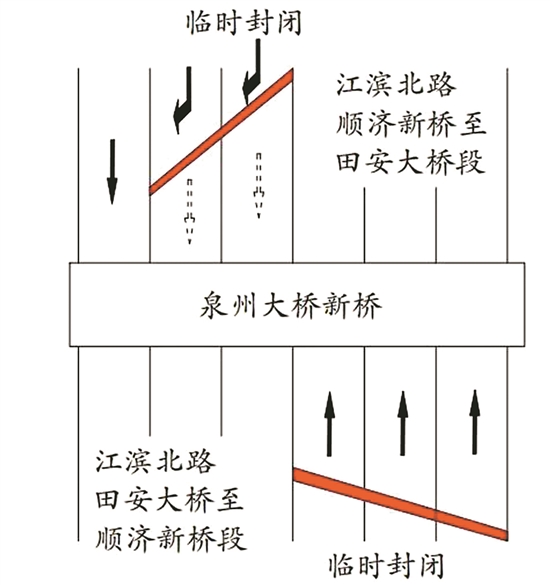 届时,江滨北路(顺济新桥至田安大桥路段)双向车道部分封闭。田安大桥往顺济新桥段仅最右侧一车道(江滨北路辅路)允许通行,其余车道禁止通行。顺济新桥往田安大桥段禁止一切车辆通行。