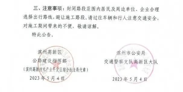 封闭路段范围内居民及周边单位、企业合理选择出行路线,避让施工路段。请过往车辆和行人注意交通安全,对施工期间带来的不便,敬请谅解