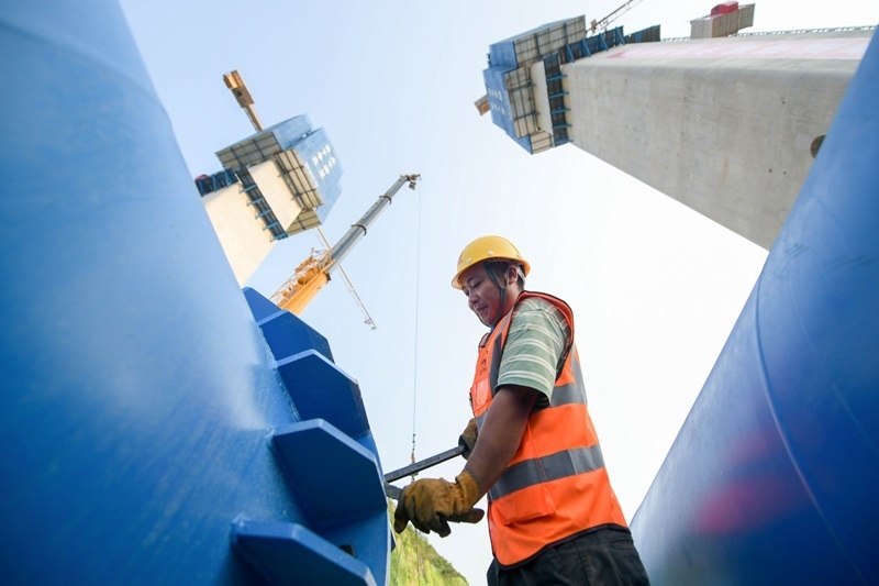 近日,在位于洛阳市新安县石井镇的济源至新安高速公路项目黄河三峡大桥施工现场,大桥主体作业正加紧推进,工人正在进行桥塔施工。