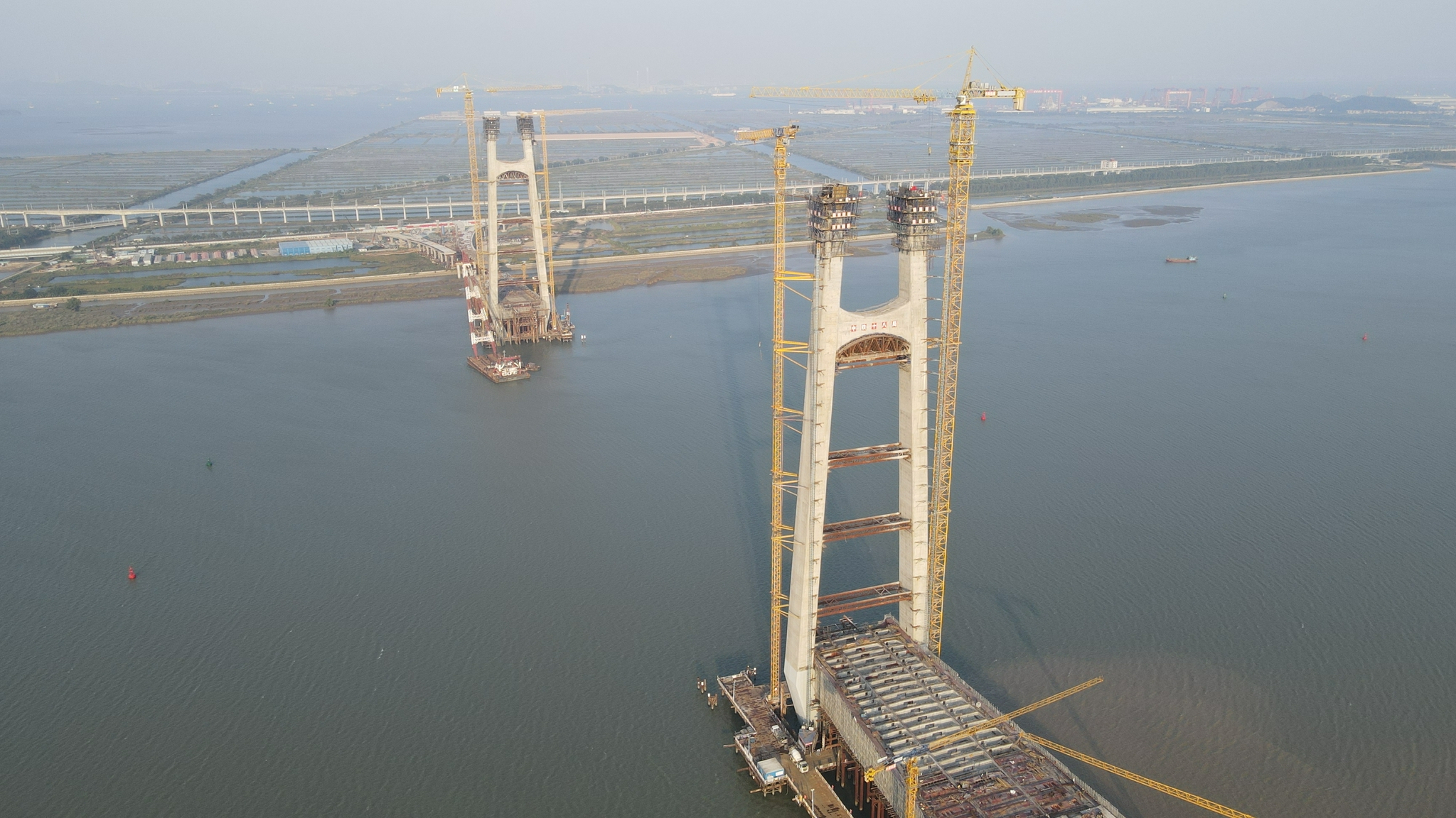 据悉,红莲大桥主桥长912米,采用双塔双索面混合梁斜拉桥型,其中25、26号索塔高度分别为180米、178米,飞跨珠江水系龙穴南水道的主桥跨度达580米。这一跨度目前在我国同类型多功能斜拉桥位居榜首。此外,为解决龙穴岛的用水、燃气、用电以及通信需求,红莲大桥还承担了多回路高压电缆、燃气、通信和输水管道的随桥过江功能,其搭载的过江市政管道规模也刷新了国内同类型桥梁之最。